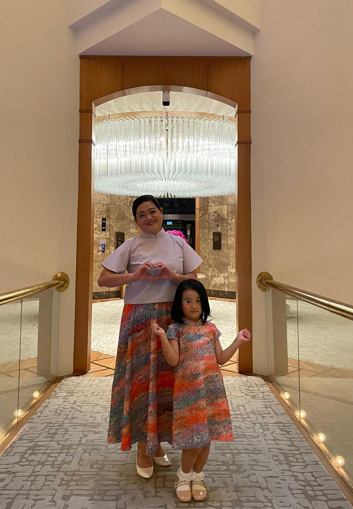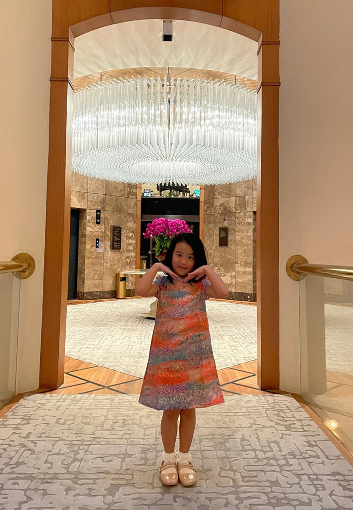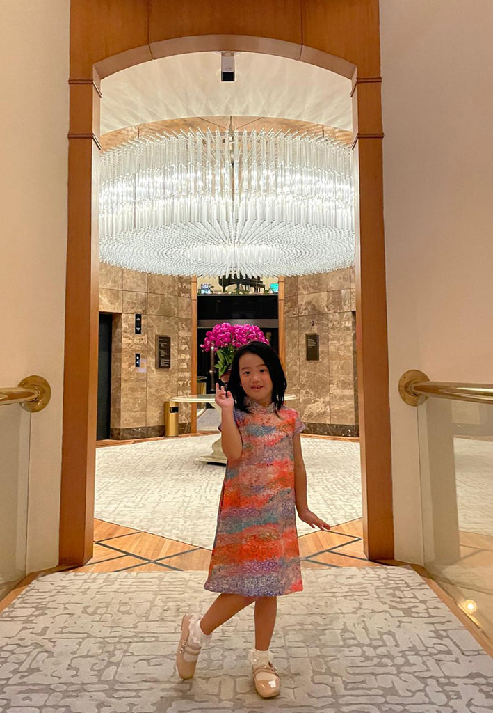 A girl’s cheongsam dress with the 'Fields of Flower' painting, in a straight cut