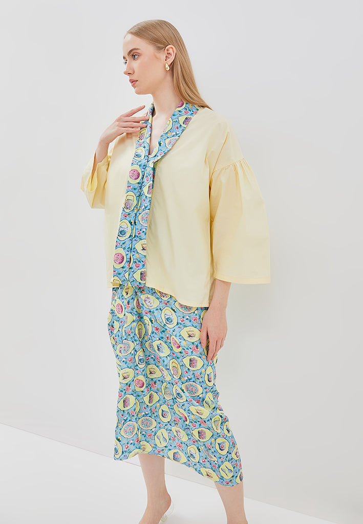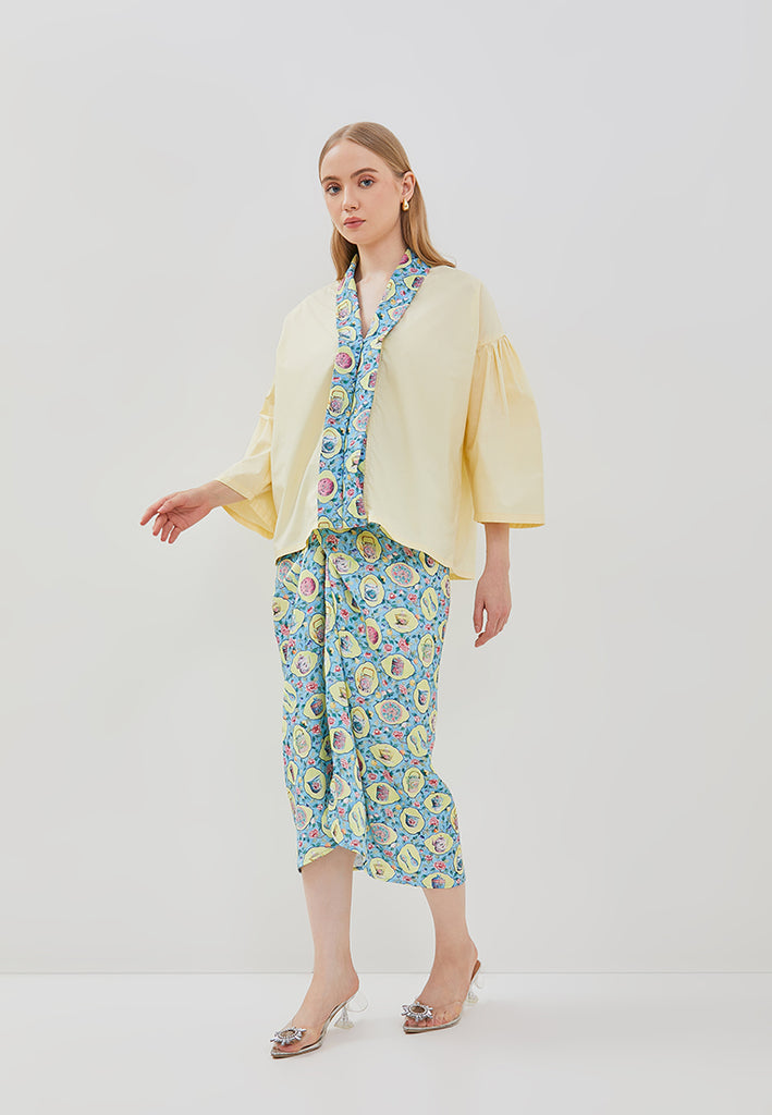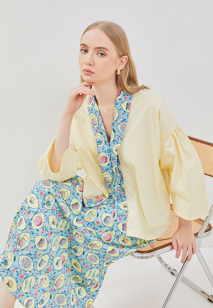 Our classic nyonya top with newly added sleeve. With Peranakan Porcelain on the collar fits perfectly the fresh yellow butter cotton top.