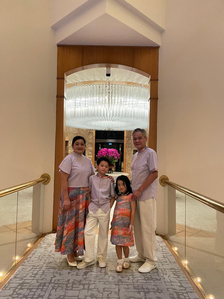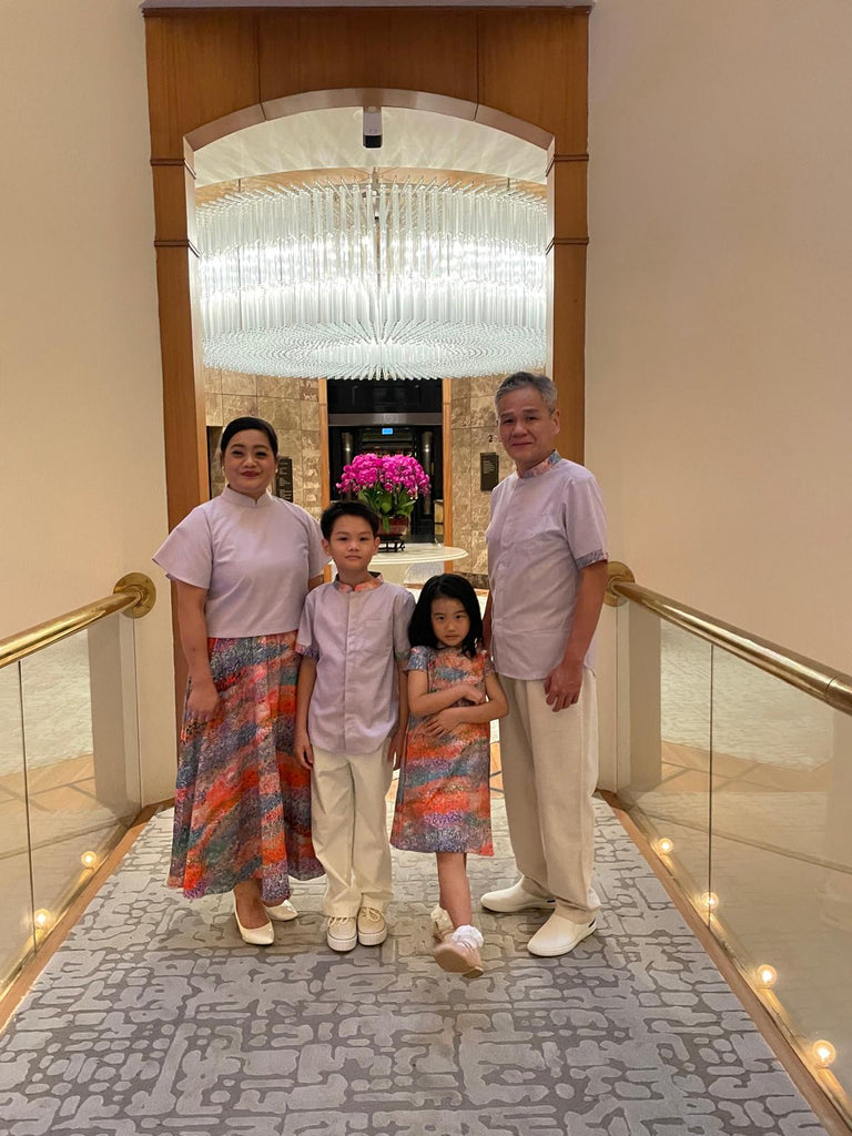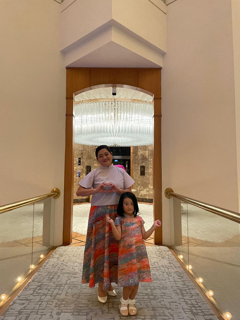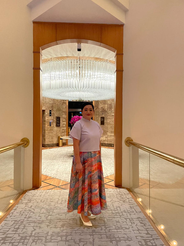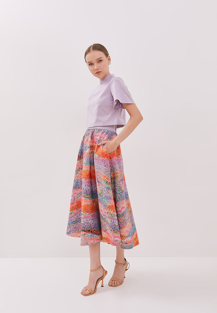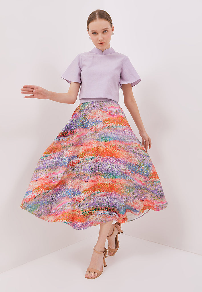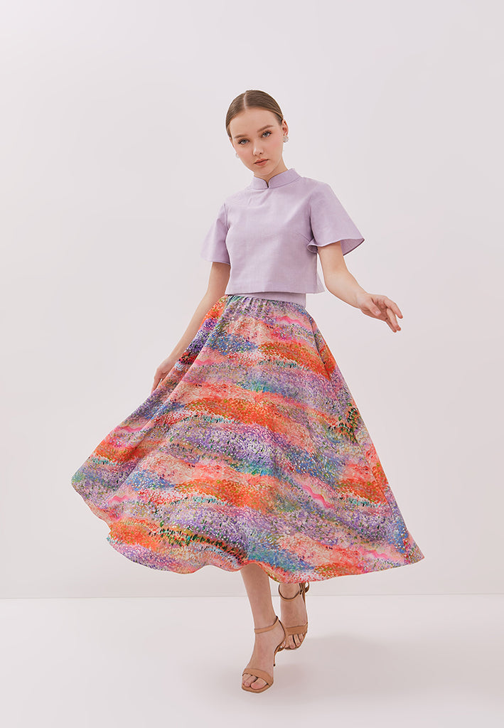 The 'Fields of Flower' painting literally resembles a field on this circle skirt, paired with a comfortable purple crop cheongsam top for a perfect combination.
